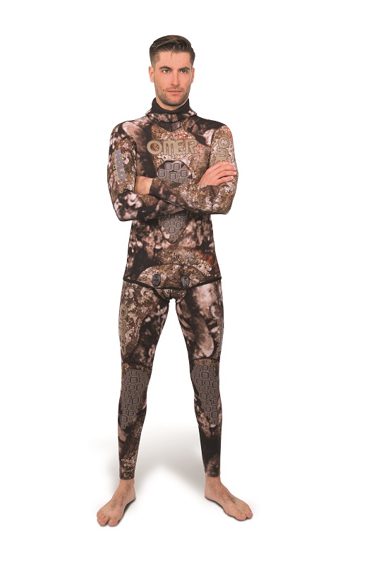 Υπεραλαστικό σακάκι της omer σε χρώμα καφέ παραλλαγής με φωτοφραφία βυθού που κάνει την στολή να φαίνεται τρισδιάστατη.