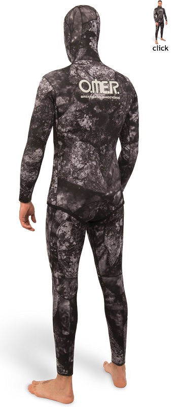 Υπεραλαστική στολή της omer σε χρώμα μάυρης παραλλαγής με φωτοφραφία βυθού που κάνει την στολή να φαίνεται τρισδιάστατη.