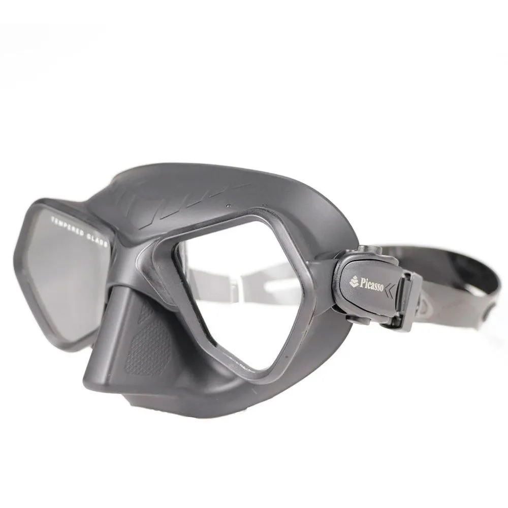 Picasso MINIMA mask has a very low internal volume but with a fantastic wide vision field, making it probably the best mask for diving between 8m and 30 meters.It also fits incredible well most of the faces.100% anti allergic Silicone.