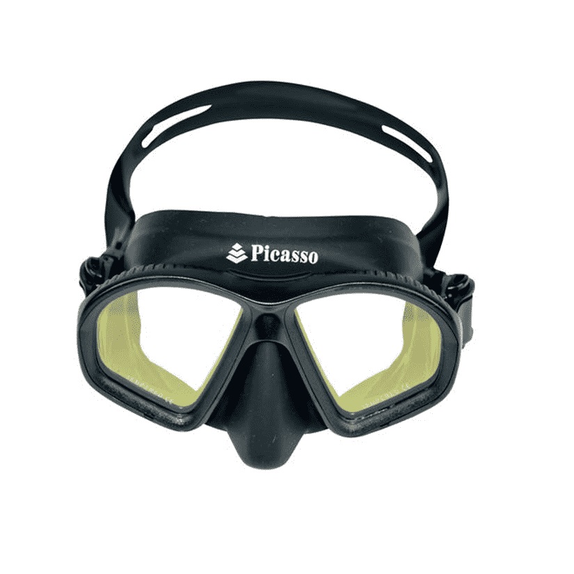 Low volume mask with a good field of vision Anti-reflex and anti-slide silicone skirt Tempered glass YELLOW LENSES that block blue light and UV rays, providing a much bigger depth perception and sharper vision. These yellow lenses improve the contrast in low light condition ( the deeper you go ) and have also a mirror effect that prevents fish from seeing your prey eyes movement and detect your hunting intentions, so they will get much closer to you, making it easier to catch them!