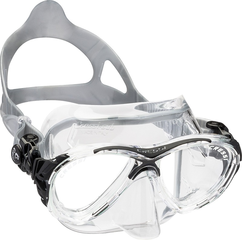 Not only has this new Cressi Crystal Silicone been chosen, with its exceptional softness and comfort, but the entire design of the skirt has followed new rules which allow a point of contact between the mask and the face that has a very open angle.