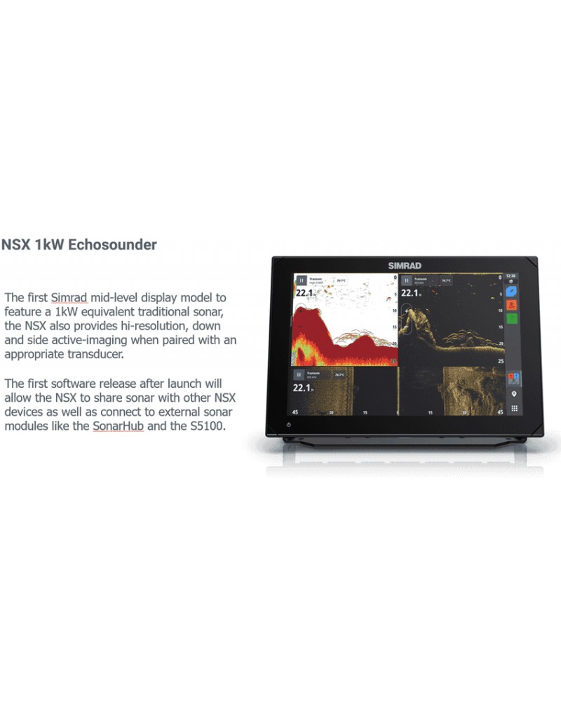 NSX 3007 - Smart Chartplotter / fishfinder. No Transducer. No Chart. 7-inch SolarMAX™ high definition display, Built-in 1 kW echosounder, GPS, and WIFI. A next-generation C-MAP® DISCOVER™ X or REVEAL X™ chart card is required.