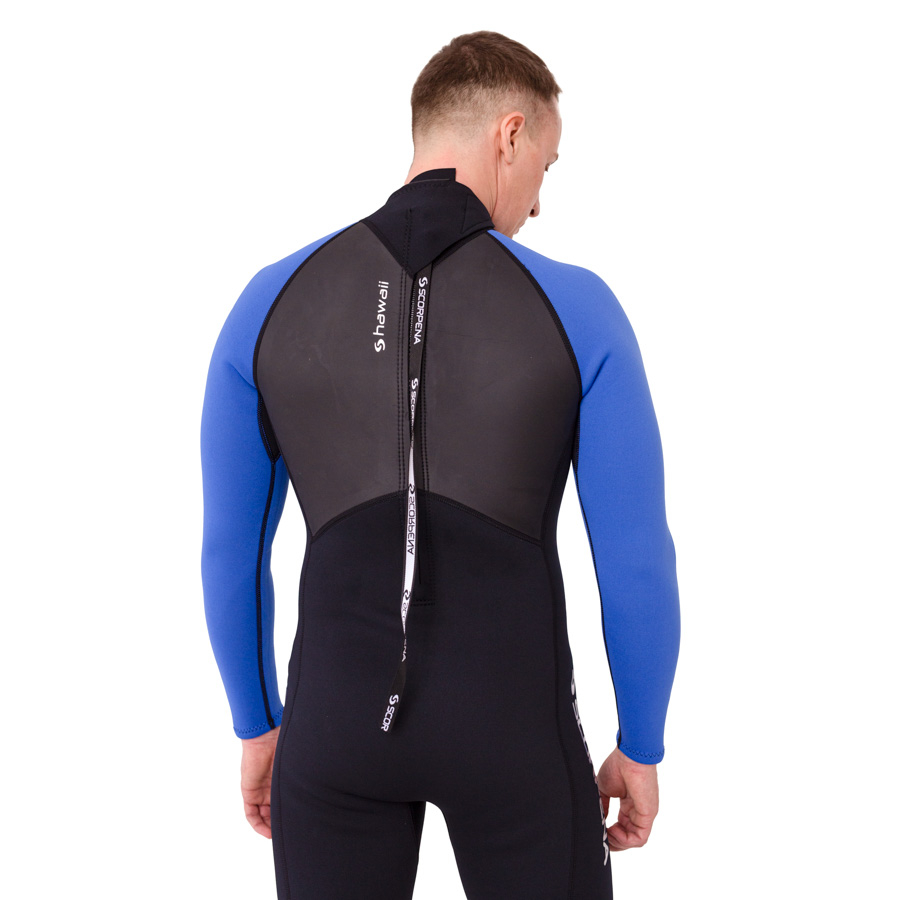 The suit is fastened with a vertically placed plastic zipper on the back, which is corrosion-resistant in salty seawater. For convenience, the zipper pull tab is equipped with a long loop with a textured surface.