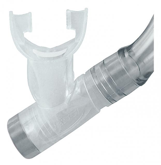 Παιδικός αναπνευστήρας διάφανης σιλικόνης με βαλβίδα στο κάτω μέρος του αναπνευστήρα και ειδικό προστατευτικό καπάκι για αποφυγή περίσσιου νερού στο πάνω μέρος.