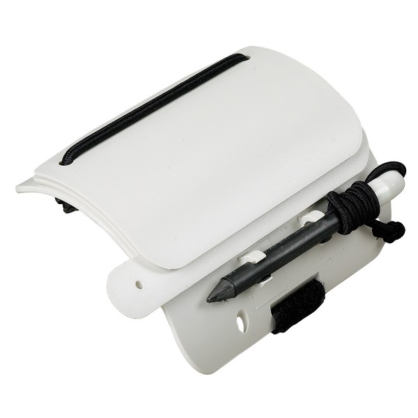 Πίνακας γραφής που προσαρμόζεται στον καρπό. Διαθέτει τρεις ξεχωριστές επιφάνειες γραφής μέσω τριών φύλλων που ανοίγουν για εύκολη πρόσβαση, ένα ελαστικό κορδόνι που ασφαλίζει τα φύλλα πίσω στη θέση τους και ένα κορδόνι που συγκρατεί το μολύβι.