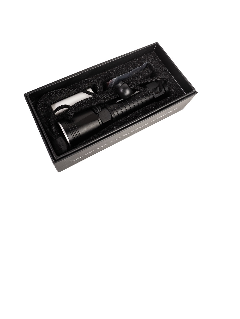 Cardboard box, elastic wrist strap, spare O-rings, orange sticker-filter, adapter for batteries.